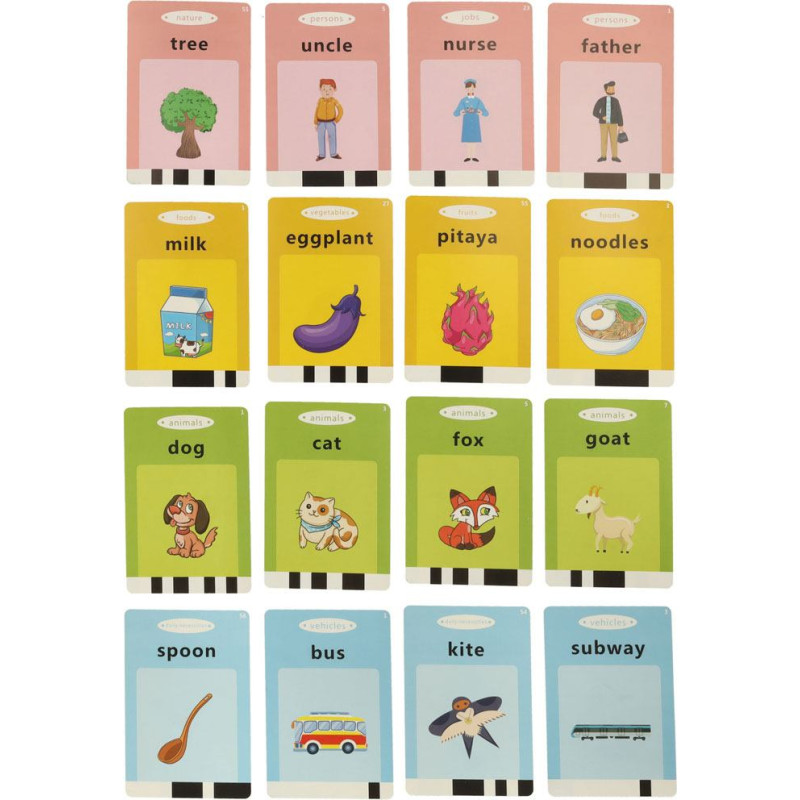 Katrā kartītē ir divi iepriekš ielādēti vārdi, pa vienam katrā pusē, un atbilstošs zīmējums, lai saprastu to nozīmi. Tas stimulē gan bērna redzi, gan dzirdi, tāpēc noteikti būs visefektīvākais mācību veids jebkuram mazulim.