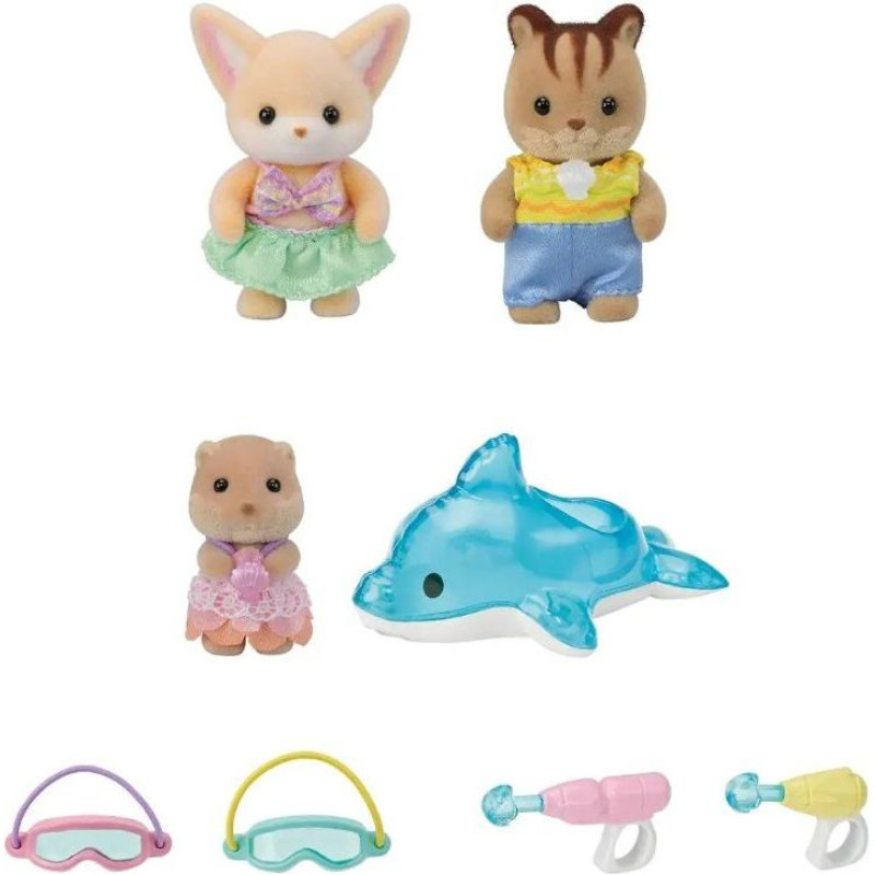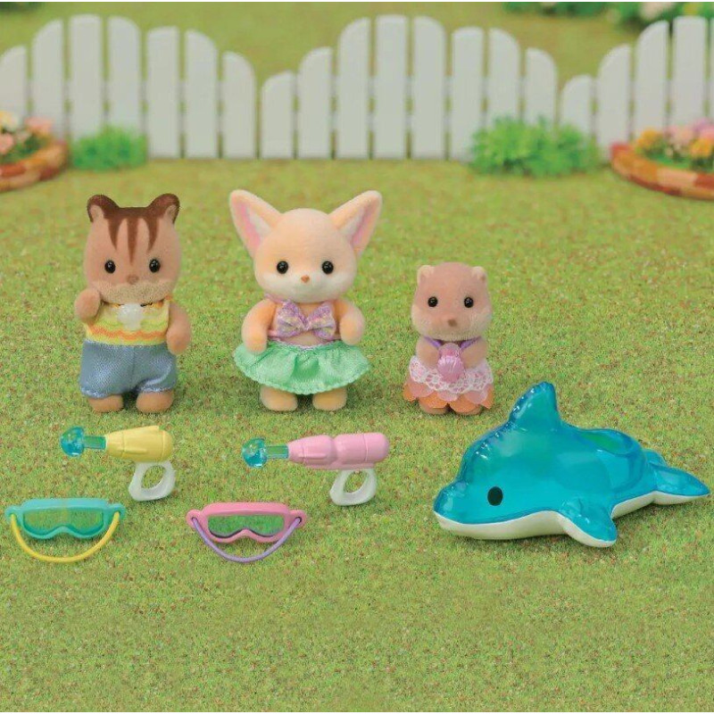 Vasaras piedzīvojumi gaida kopā ar bērnudārza draugu jautro baseina rotaļu komplektu no Sylvanian Families! Šis brīnišķīgais komplekts ir ideāls piedāvājums bērniem, kuriem patīk ūdens prieks. Ietver trīs burvīgas dzīvnieku figūras, kas ir gatavas plunčāties baseinā. Katra figūra ir ģērbusies peldkostīmā un ir gatava spēlēties ūdenī. Papildus figūrām komplektā ir arī tādi aksesuāri kā peldēšanas brilles, ūdens pistoles un "piepūšamais" delfīns. Komplekts stimulē radošumu un palīdz attīstīt roku prasmes un acu-roku koordināciju. Šis komplekts ir lielisks veids, kā attīstīt iztēli un stāstīšanas prasmes, ļaujot bērniem veidot savus stāstus un rotaļu scenārijus. Ļaujiet savam bērnam pievienoties jautrībai un atklāt Sylvanian Families burvību!