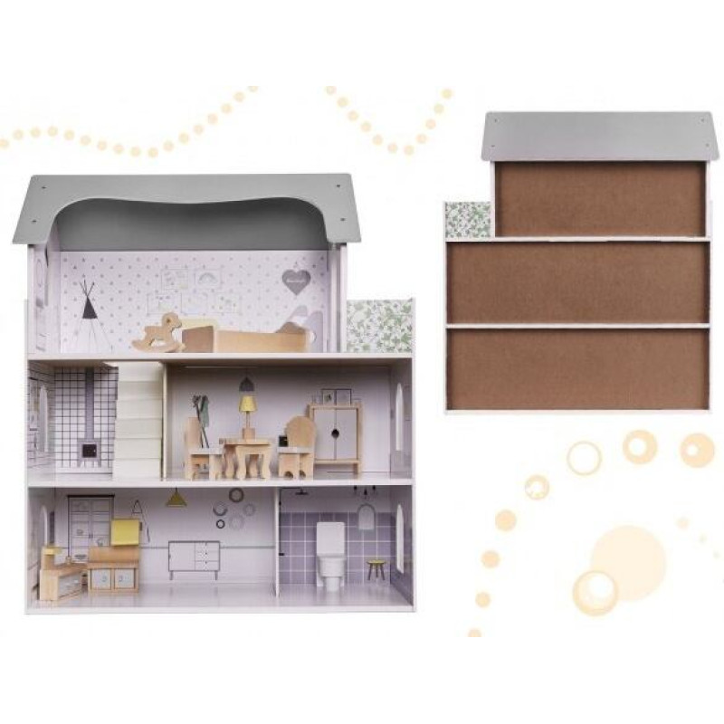 Koka, 3 stāvu leļļu namiņš, kuru var salikt pašam. Dekorēts ar krāsainiem mēbeļu attēliem. Tajā ir arī atveramas koka mēbeles. Krāsa: pelēka. Augstums: 70 cm.