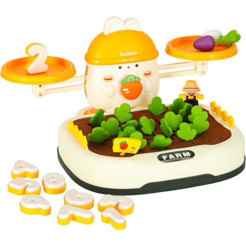 Komplekta augšpusē valda apburošs trusis, kas "sargā" līdzsvaru. Bērns var sakraut burkānus vai citus priekšmetus, cenšoties saglabāt līdzsvaru vai apzināti to izjaukt, vienlaikus apgūstot fizikas pamatus un loģisko domāšanu. Komplektā ir arī īpaši skaitļi - katram skaitlim ir atbilstošs svars, kas atbilst attēlotajam skaitlim. Tas ļauj mazulim eksperimentēt, salīdzinot svarus un praktiski apgūstot skaitliskās vērtības! Šī spēle ir lieliski piemērota, lai atbalstītu skaitīšanas un matemātisko pamatjēdzienu apguvi.