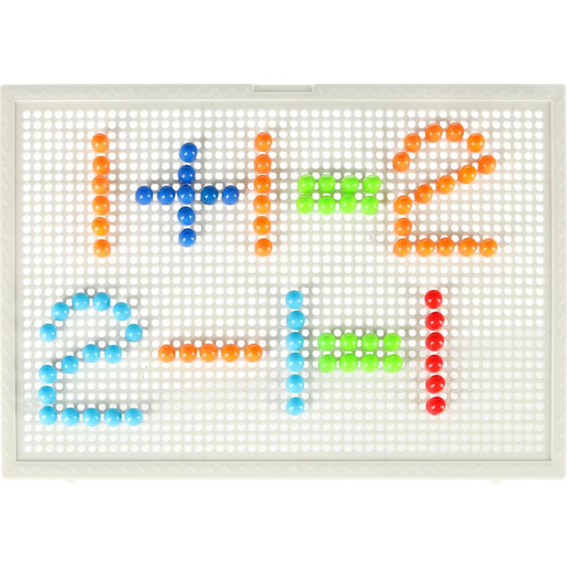 Vienkārša rotaļlietasastāv no dažāda izmēra krāsainām plastmasas piespraudēm un perforēta piespraužu dēļa.