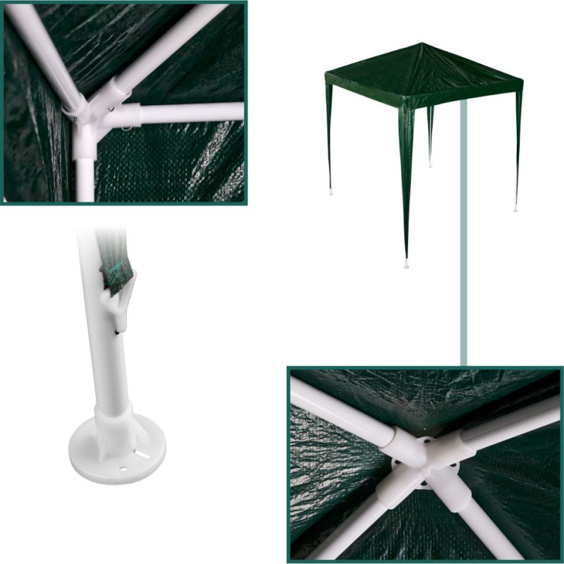 Liels dārza paviljons zaļā krāsā. Lieliski piemērots ģimenes dārza ballītēm. Pateicoties tā izmēriem 1,9x1,9, zem tā var novietot galdu un krēslus. Tas nodrošina aizsardzību no saules un neliela lietus. Rāmis ir izgatavots no metāla caurulēm, padarot visu konstrukciju stabilu. Visas nepieciešamās montāžas sastāvdaļas ir iekļautas komplektācijā.