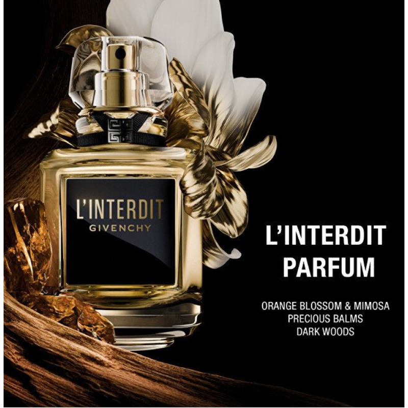 Givenchy L’Interdit Parfum ir intensīvs ziedu-koksnes-ambras parfimērijas ūdens, kas godā pārdrošu, neatvainojošu sievišķību. Tas padziļina oriģinālo L’Interdit parakstu ar bagātākām, siltākām notīm, ietverot ādu jutekliskā, ilgi noturīgā plīvurā. Tās sirdī spožs baltziedu pušķis kontrastē ar tumšām, gardām un koksnainām notīm, atstājot neaizmirstamu nospiedumu. Radīts sievietēm, kuras uzdrīkstas pārkāpt robežas, šīs smaržas pārvērš ik mirkli par izsmalcināta valdzinājuma apliecinājumu.