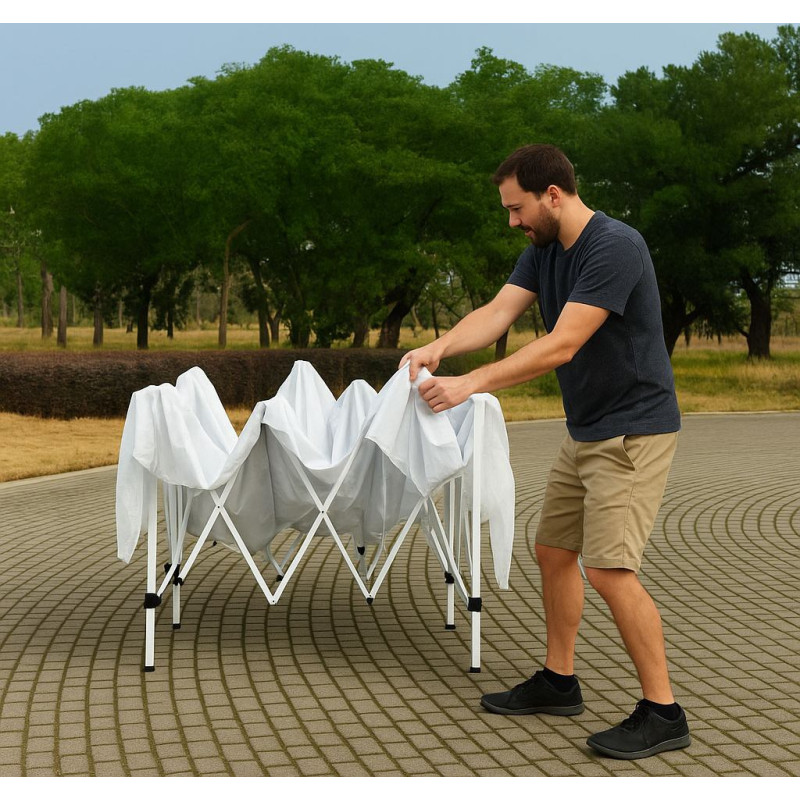 • The tent frame – made of powder-coated steel with profiles 25x25 mm, 20x20 mm, and 10x18 mm. This ensures the structure retains its durability and doesn’t deform, even in strong winds or frequent use.