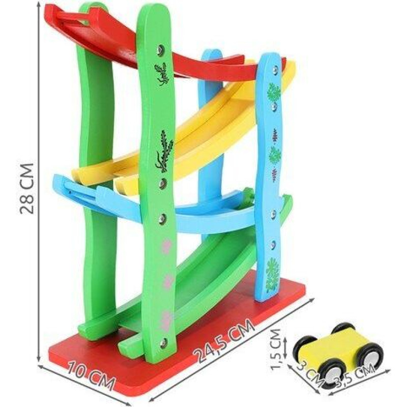 • koka slidkalniņš lieliski pilda izglītojošu lomu. Jūsu bērns iemācīsies atpazīt krāsas un skaitīt līdz 4, kā arī iemācīsies cēloņus un sekas, liekot trasē automašīnas.
