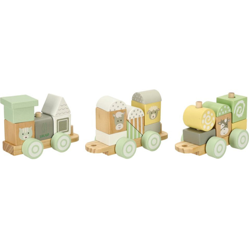 LULILO koka vilcieniņš ir ideāla izvēle pašiem mazākajiem bērniem. Trīs vagoni, kas sastāv no dažādiem blokiem, nodrošina spēlē daudz variāciju – vagoni katru reizi var izskatīties savādāk. Bērns klucīšus var sakārtot jebkurā formā un kombinācijā, ļaujot vaļu fantāzijai. Viss komplekts ir izgatavots no koka, kas drošības apsvērumu dēļ ir noslīpēts un krāsots ar netoksisku krāsu.