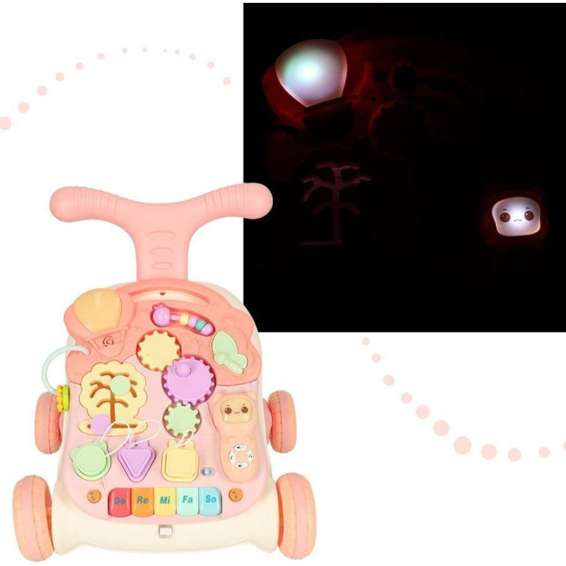 Bērnu staigulītis 2in1 - staigulīti var pārvērst par interaktīvu galdu. Produkts satur daudzus elementus, kas būtiski ietekmēs bērna attīstību – manuālās un intelektuālās prasmes. Materiāls: plastmasa. Staiguļa izmēri: 36 cm x 40 cm x 43 cm.