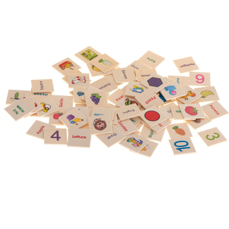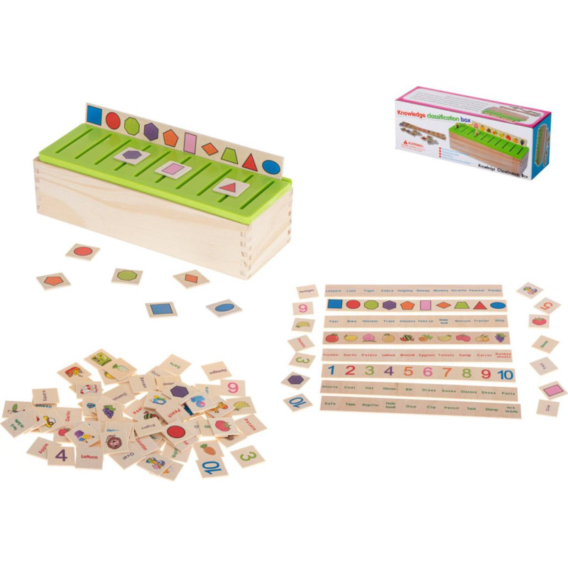 Izglītojoša šķirotāja-puzle koka kastē. Jums ir jāsaskaņo attēls un jāievieto caurumā. Spēle palīdzēs iemācīties vārdus angļu valodā. Komplektā ietilpst: kastīte un divu veidu šķīvji ar attēliem. Izmēri: 28x10x8 cm.