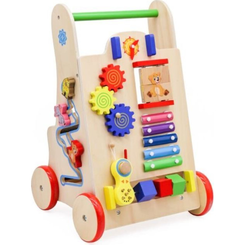 Daudzfunkcionālais koka bērnu stūmējs palīdzēs vieglāk iemācīties staigāt. Priekšējā panelī ir dažādas rotaļlietas: vārpstas, attēlu puzle, kustīgi kubi, šķīvji, telefons un pulkstenis. Sānos ir šķirotājs un labirints. Izmēri: 51x32,5x31 cm.