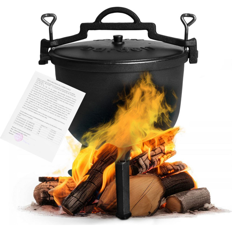A solid and durable 15-liter cast iron cauldron is the perfect choice for preparing aromatic meals outdoors as well as at home. It guarantees exceptional flavors and unforgettable culinary experiences, adding a unique atmosphere to every outdoor gathering. Cast iron distributes heat evenly, making it ideal for slow simmering, cooking, and roasting.