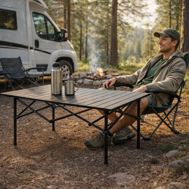 The rolled tabletop made of slats creates a comfortable surface for everyday use. It works perfectly for meals, preparing snacks or placing drinks and small accessories during camping, picnics or barbecues.