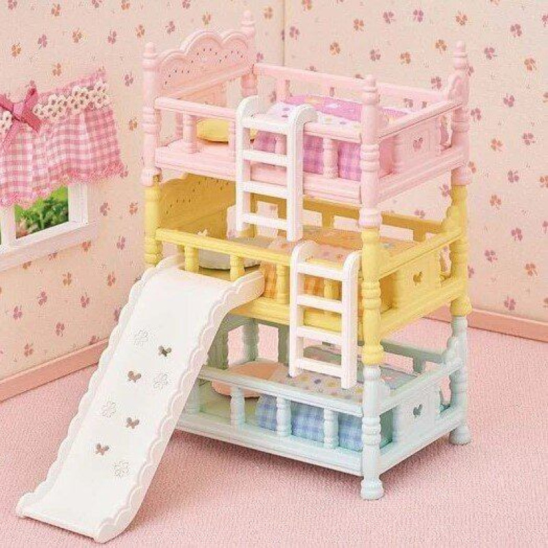 Parūpējieties par mazo Sylvanian Village iedzīvotāju saldajiem sapņiem, izmantojot trīsvietīgo gultu Sylvanian Families. Šis krāsainais komplekts ir lieliska vieta atpūtai trīs Silvānas maziem bērniem. Katrs šīs burvīgās divstāvu gultas stāvs ir aprīkots ar mīkstu matraci, nodrošinot ērtu miegu. Gultas pasteļtoņos rozā, dzeltenā un zilā krāsā ar drošības reliņiem. Papildus balts slidkalniņš ar smalkiem ziedu un tauriņu rakstiem, kas rada jautrību, no rīta ceļoties.