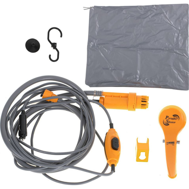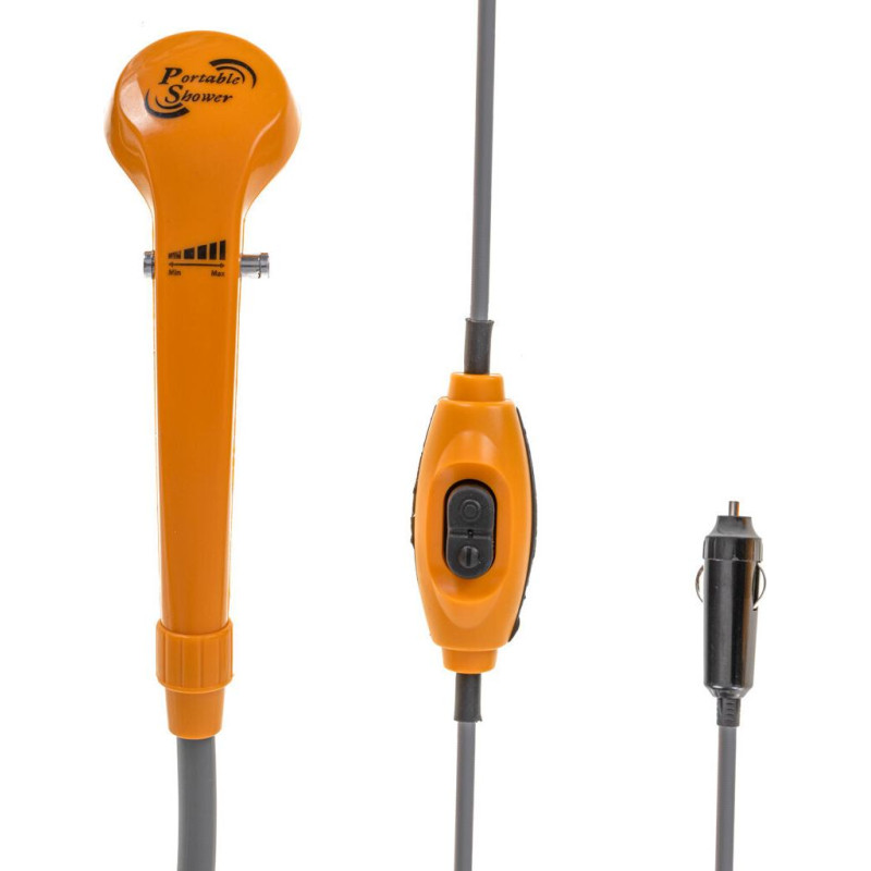Praktiska ceļojumu duša, ko var izmantot jebkuros apstākļos. Tam ir regulējama ūdens plūsma un filtrs. Komplektā ietilpst piesūceknis un āķis ērtai izstrādājuma pakāršanai. Barošanas avots: 12 V. Šļūtenes garums: 2 m. Roktura diametrs: Karotes diametrs: 6 cm.