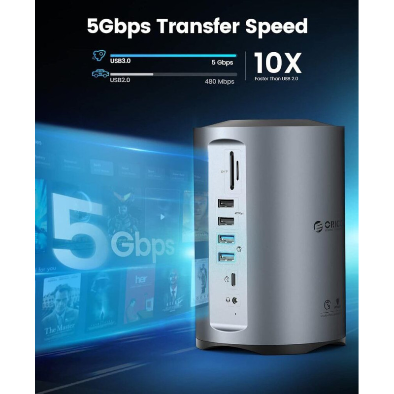 ORICO dokstacija, 15-in-1 USB-C dokstacija, divu monitoru stacija MacBook Pro M1/M2/Windows, klēpjdatora dokstacija ar diviem 4K HDMI, 8 USB pieslēgvietām, DP, RJ45, TF/SD, 100 W PD, ORICO-CDH-YD2-GY-BP-EU