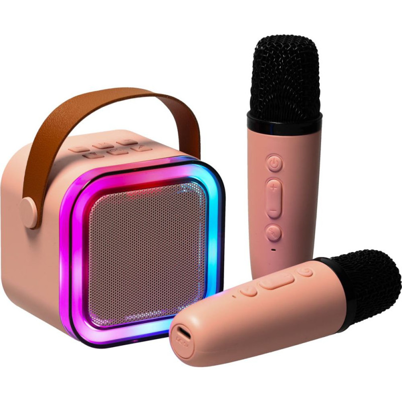 Karaoke komplekts 2 mikrofoni + portatīvais skaļrunis BLUETOOTH USB LED rozā krāsā