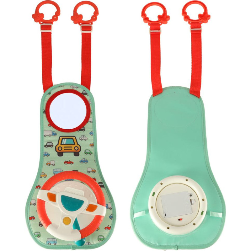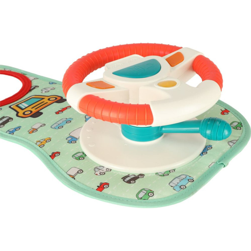 Tas sastāv no stūres rata ar 4 pogām un sensorās vadības ierīces, kā arī plastmasas drošības spoguļa. Elementi ir novietoti uz stingra spilventiņa, kas pārklāts ar patīkamu audumu ar rotaļu automobiļu motīvu.