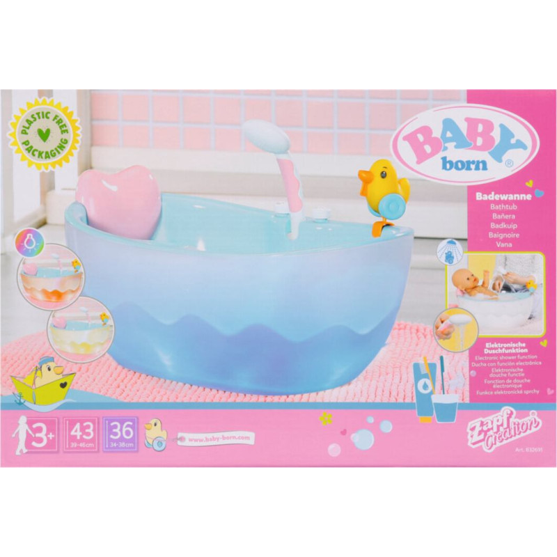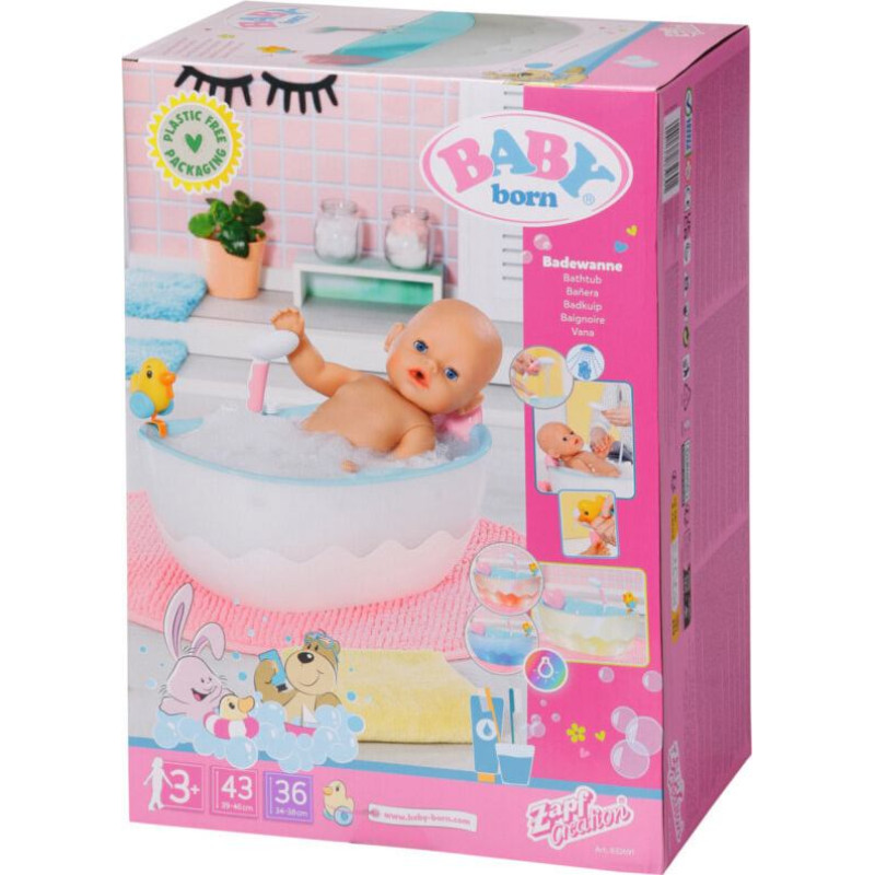 BABY born mīļākā vieta ir vanna. Šai mazajai meitenei patīk mērcēties savā iecienītākajā vannā, bet arī jūsu mazajiem patiks ar viņu spēlēties. Ja vanna ir tukša, jūs varat dzirdēt šļakatas un ūdens skaņas, kas imitē īstas ūdens rotaļas. Vanna maina krāsas un tai ir skaņas efekti.