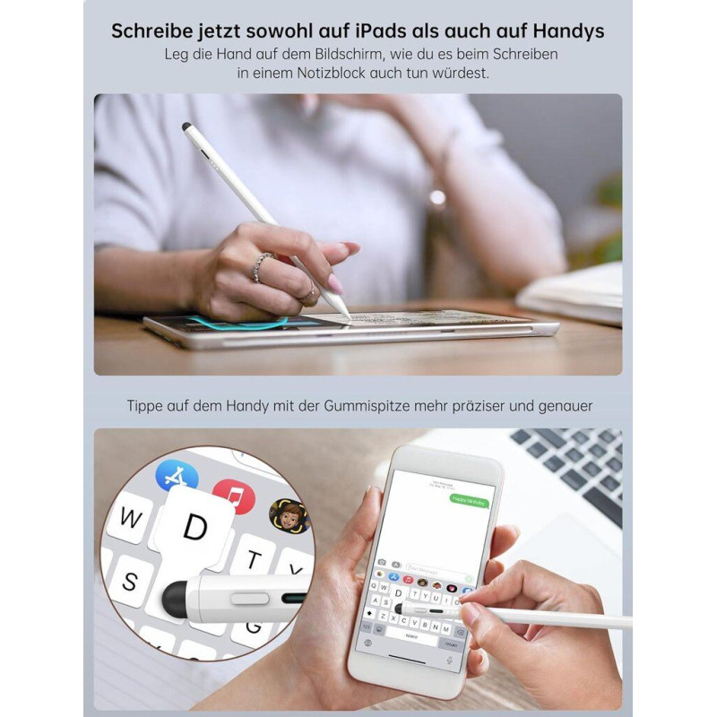 Tagad rakstiet iPad un mobilajos tālruņos: Ar šo rakstāmspalvu varat ērti novietot plaukstu uz ekrāna, gluži kā rakstot uz blociņa, un nevēlami taustiņi netraucēs darbu. Tas nodrošina arī spēcīgu magnētisko saķeri ar iPad malu, kas pārspēj pat Apple Pencil, tāpēc tas ir ideāli piemērots lietošanai ceļā. Pateicoties 2 in 1 dizainam, jūs varat viegli apgriezt iPad pildspalvu un ievietot gumijas uzgalīti, lai viegli zīmētu uz lieliem laukumiem. Turklāt šis iPad pildspalva tagad ļauj precīzi un precīzi rakstīt ar gumijas uzgaļa palīdzību viedtālruņos.