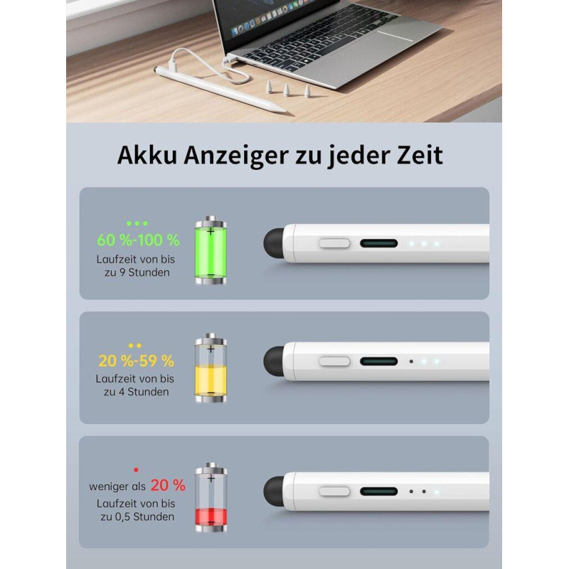 MEKO uzlabotai Apple Pencil pildspalvai ir ātrās uzlādes funkcija, kas ļauj pilnībā uzlādēt tikai 13 minūtēs. Tas nodrošina ātru un efektīvu pildspalvas barošanu, kas ir ideāli piemērota lietošanai ceļā, birojā, skolā vai mājās. Turklāt automātiskā izslēgšanās pēc 10 minūšu nelietošanas palīdz taupīt enerģiju un sasniegt maksimālo darbības laiku - 9 stundas.