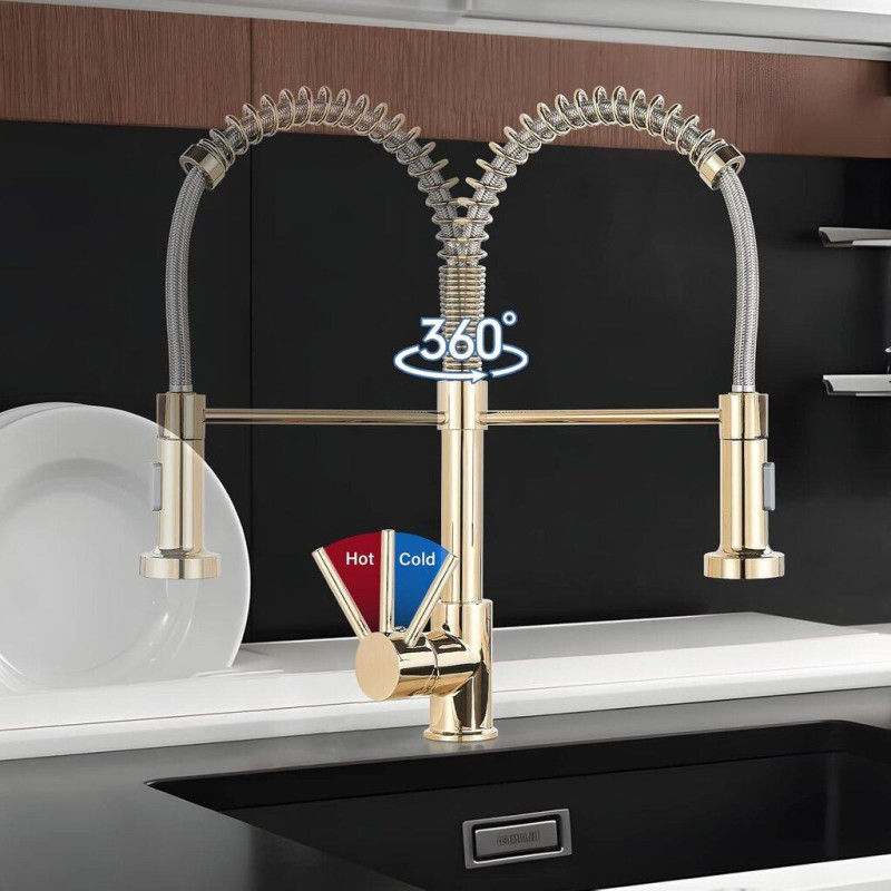 Pielāgojams dizains: virtuves zelta krānam ir caurspīdīgs dizains ar redzamām atsperēm un zelta krāsas apdari, kas atbilst dažādiem virtuves stiliem. Uzgalis ir pārvietojams noteiktā vietā tīrīšanai, padarot to elastīgu un vieglu. Tam ir arī pietiekams augstums, lai novietotu visu veidu katlus un pannas ērtai tīrīšanai.