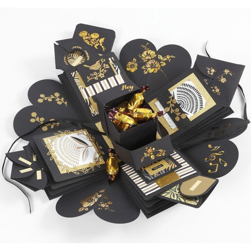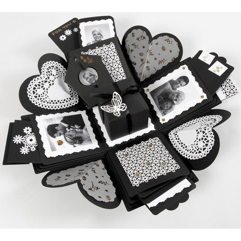 Melna sprādziena kaste ir kartona kaste, kas atgādina mazu dāvanas kastīti, kas, atverot, izplešas dažādos kabatās un nodalījumos. Šī sprādziena dāvanu kaste sastāv no 12 fiksētām kabatām, 12 dekoratīviem elementiem (8 dažādas formas), mazākas kastes iekšpusē un satin lente.