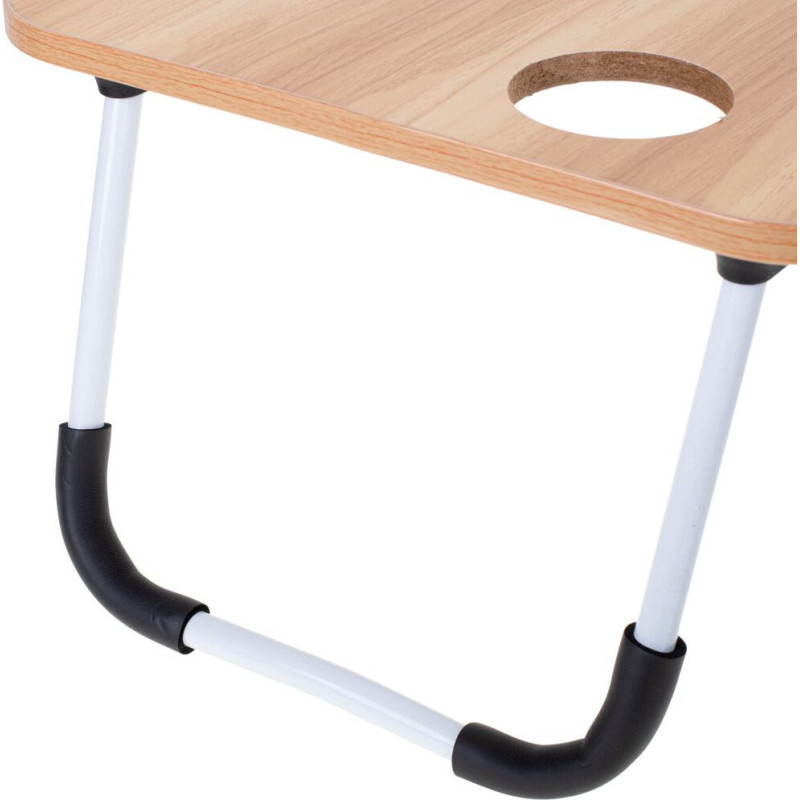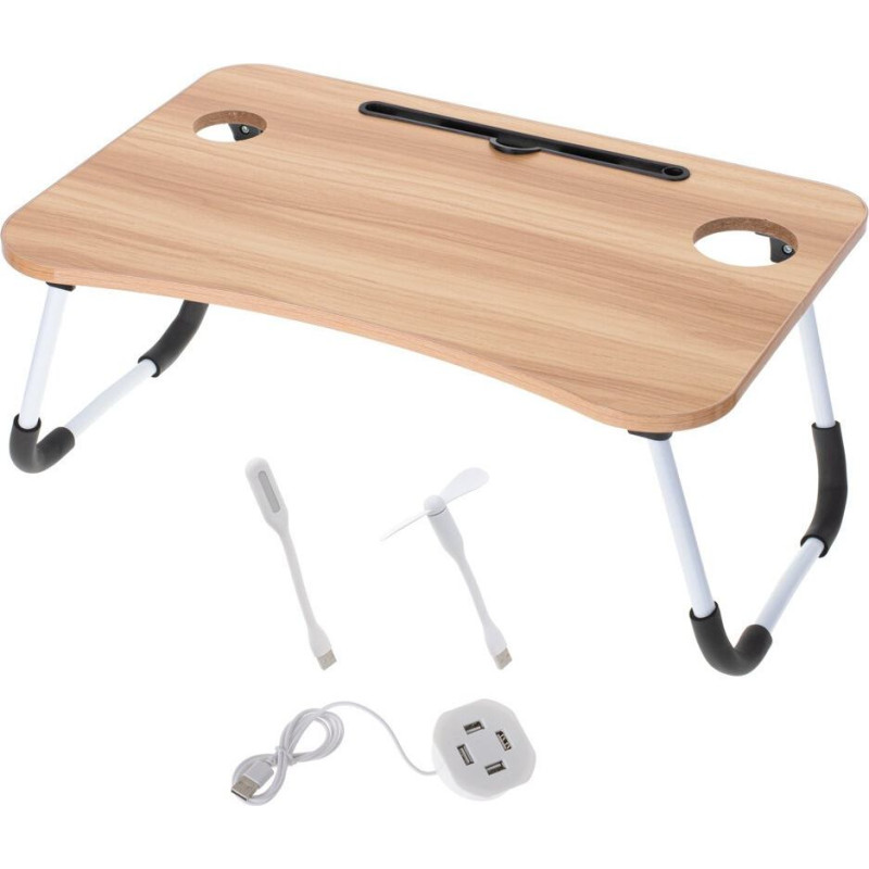 Praktisks klēpjdatora galds, kas jebkuru telpu pārvērtīs birojā. Tam ir iebūvēts USB panelis ierīču uzlādēšanai un praktiska atvilktne. Materiāls: MDF + metāls. Galda izmēri: 60x39,5x1 cm. Augstums nesalocītā stāvoklī: 26 cm.