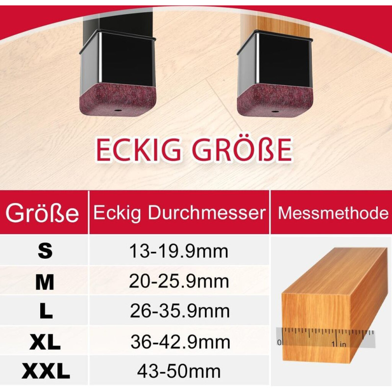 24 kvadrātveida krēslu kāju vāciņu iepakojums, 39-51 mm