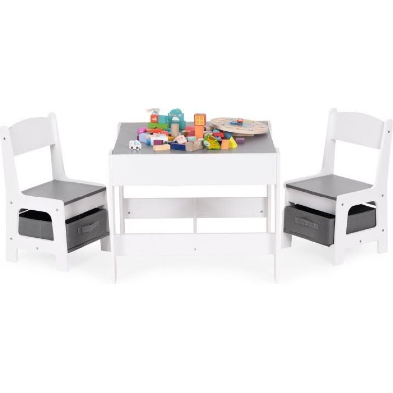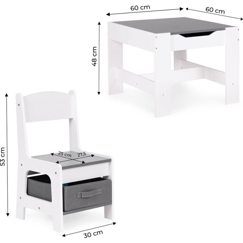 Galds ir aprīkots ar praktisku, noņemamu virsmu, zem kuras atrodas ietilpīgs glabāšanas nodalījums. Pietiek tikai ar vienu kustību, lai bērns varētu sniegties pēc saviem iecienītākajiem krītiņiem, klucīšiem vai grāmatām – neceļoties un nepārtraucot rotaļu. Šis ir lielisks risinājums, kas ne tikai atvieglo ikdienas aktivitātes, bet arī māca patstāvību un telpas organizēšanu. Gudri izstrādāta mēbele nozīmē, ka visi nepieciešamie priekšmeti vienmēr ir pa rokai, un bērna istaba paliek tīra un sakārtota.