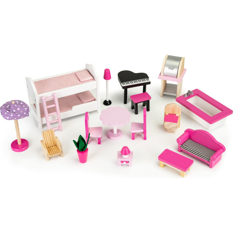 The set also includes a set of 16 wooden furniture, which can be freely removed and rearranged without any restrictions!