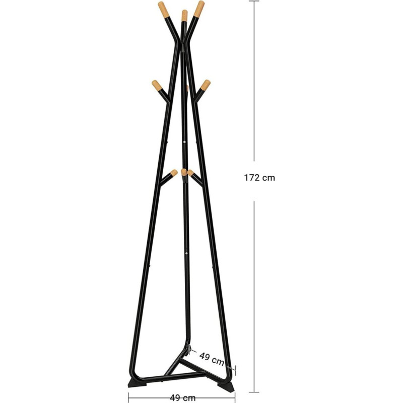 This space-saving product has a stable triangular base, which ensures that the product will not tilt with additional load . In addition, the product is equipped with 9 rounded beech hooks for storing coats, jackets, bags, scarves and hats.